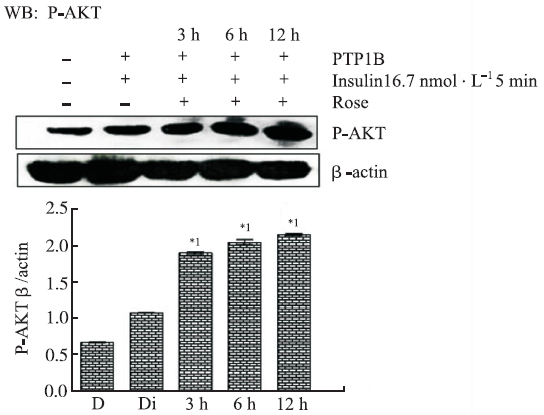 Effect of rose extract on the level of phosphorylated-AKT in the CHO-K1 cell line overexpressing PTP1B “+”and“-”:represent “positive”and“negative”,Compared with Di group,t=72.68,46.75,131.50,*1P<0.01;D.blank control group; Di.negative control group; 3 h,6 h and 12 h,represent the incubation time of rose extract