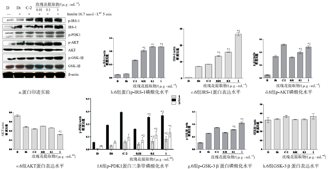 Objective To evaluate hypoglycemic activity of rose extracts in vitro,find insulin-stimulated signaling pathway which rose extracts act on and illuminate its action mechanism. Methods CHO-K1 cell model was transfected to overexpress PTP1B by using liposome-mediated plasmid transfection methods,and the effects of rose extracts on expression of signal regulatory protein molecules were studied in vitro through western blot analysis. Results Rose extracts effectively inhibited PTP1B activity with IC50 value of 62.31 ng·mL-1 and increased glucose consumption, the effects were similar to the positive group; Rose extracts obviously elevated phosphorylated levels of IRS-1、 PDK1、AKT and GSK-3β. Conclusion Rose extracts had good inhibitory activity against PTP1B and promoted glucose consumption in CHO-K1 cell,which suggested it had potential hypoglycemic activity.Furthermore, rose extracts activated PI3K/AKT signaling pathway by increasing phosphorylated levels of IRS-1、PDK1、AKT and GSK-3β,and then promoted insulin signal transduction and glycogen synthesis.By these means, rose extracts ultimately achieved the goal of lowering blood sugar.