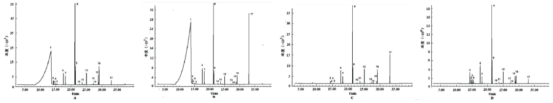 A.β-CD包合物凝胶膏剂;B.β-CD与挥发油混合物凝胶膏剂;C.β-CD包合物涂敷皮肤上;D.挥发油涂敷皮肤上;1.甘油;2.优葛缕酮;3.冰片;4.松油烯-4-醇;5.α-萜品醇;6.3,5-二甲氧基甲苯;7.黄樟醚;8.甲基丁香酚;9.1,2,3-三甲氧基-5-甲基苯;10.肉豆蔻醚;11.十五烷;12.榄香素;13.百秋李醇;14.3-丁烯基苯酞;15.川芎内酯A;16.顺式-藁本内酯;17.邻苯二甲酸二丁酯