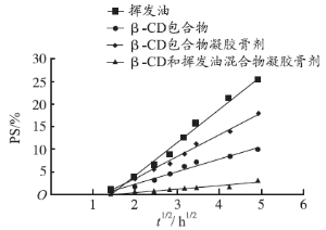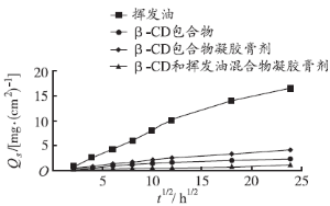 4种含挥发油物质的体外透皮扩散实验表明,挥发油直接涂敷在皮肤上,经皮渗透速率最大。但是,液体的挥发油直接使用,有诸如污染衣物、不便施药、容易在空气中被氧化变质和挥发丢失等不便。用β-CD包合川芎细辛挥发油,液体药物固体化,便于加工制备,增加药物稳定性[2,9-10]。凝胶膏剂(巴布剂)是由水溶性高分子材料制成基质,具有载药量大、贴敷舒适、透皮效果好、对皮肤无刺激性等特点,是新型的外用制剂。将挥发油的β-CD包合物制备成凝胶膏剂,经皮渗透速率大于挥发油与β-CD混合物凝胶膏剂,表明挥发油的β-CD包合物具有增加药物经皮渗透作用[11]。这种增加渗透作用可能是由于凝胶膏剂中的保湿剂、促渗透剂等运送一簇β-CD包合的挥发油到皮肤表面,比运送未包合的单个挥发油的组分到皮肤表面,其扩散效率高得多。β-CD包合物凝胶膏剂,经皮渗透速率大于用水湿润的β-CD包合物直接涂敷皮肤上。表明凝胶膏剂中的保湿剂,促渗透剂等对包合物中的挥发油组分的促渗透作用比水略强。