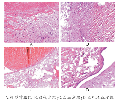 | Fig.1 Pathological change of inferior vena cava in four groups of rabbits detected by light microscope(HE,×100)A.model control group;B.Yiqi Fang group;C.Huoxue Fang group;D.Yiqi Huoxue Fang group |