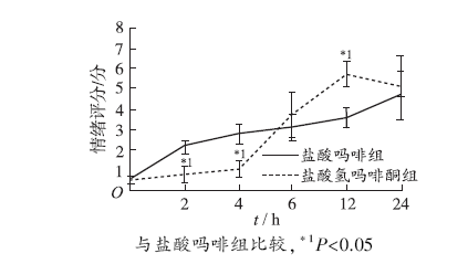 | Fig.1 Fig.2 Emotion score of two groups of patients 24 h after operation({Invalid MML}±s,n=45,47)Compared with morphine hydrochloride group,*1P<0.05 |