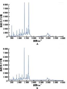 精密称量尼莫地平晶A型和晶B型各30 mg,分别进行拉曼光谱分析。通过对晶A型和晶B型样品的拉曼光谱图的分析比较,根据峰位置和峰强度不同,可有效鉴别2种晶型。见