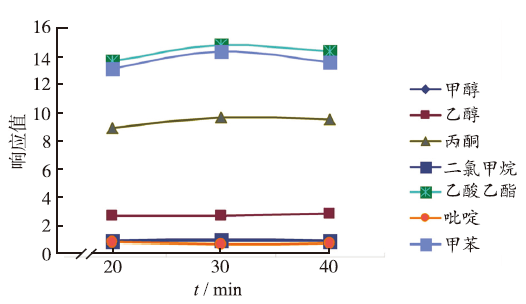 7种溶剂在不同平衡时间的响应值