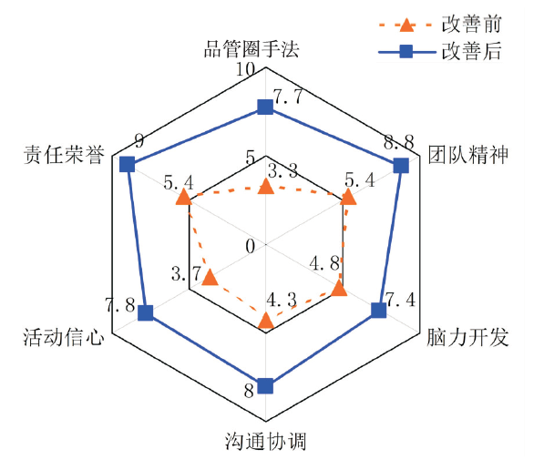 采用自制评分表,对每位圈员进行团队精神、责任荣誉、品管圈手法、活动信心、脑力开发及沟通协调这6 项内容的调查。每项0~10分,分别统计6项内容总分,计算出平均分与改善前比较。见