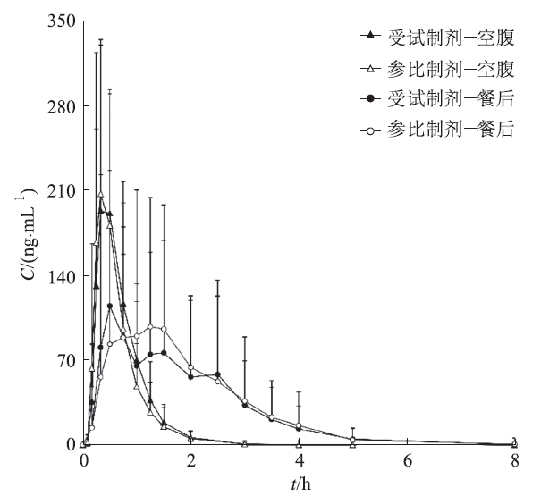 Fig.1 Mean plasma concentration-time profiles of tenofovir alafenamide after oral administration of test and reference preparation under fasting and fed conditions in 42 healthy volunteers