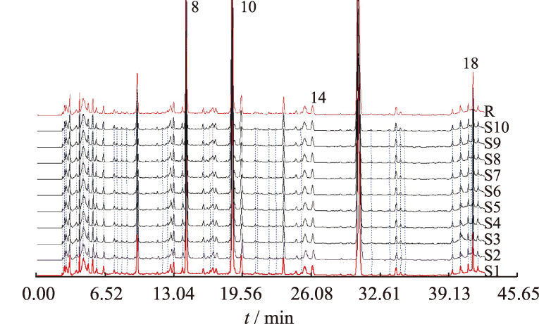 | 图2 10批白虎汤HPLC指纹图谱与对照图谱 8.新芒果苷;10.芒果苷;14.甘草苷;18.甘草酸铵。 |