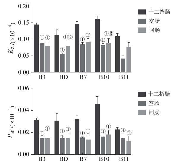 | Fig.1 Kaand Peff of pulchinenosides in duodenum,jejunum and ileum($\overline{x}$±s,n=5) ①Compared with duodenum,P<0.01;②Compared with jejunum,P<0.05;③Compared with jejunum,P<0.01;④Compared with duodenum,P<0.05. |