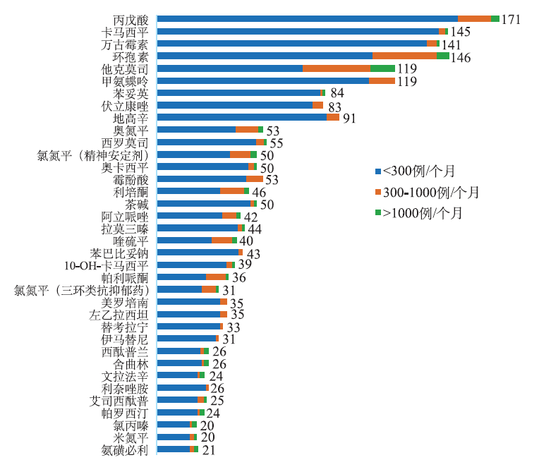 | 图3 上报单位数超过30的药物月检测量分布 图中数字为上报单位总数量,部分单位未上报检测结果。 |