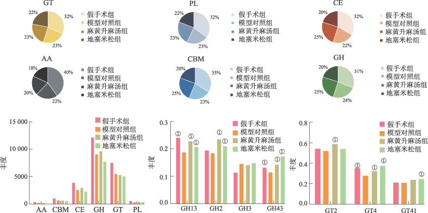 | Fig.8 Comparison of abundance of carbohydrate active enzymes in each group ①Compared with model control group,t=-10.251—3.128,P< 0.05. |