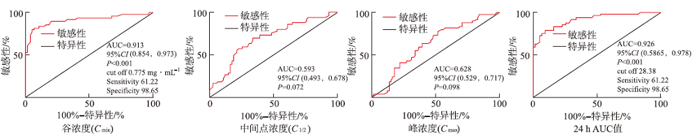 目前国内外对替加环素血药浓度的研究集中在与疗效的相关性上,已有临床研究发现针对不同的感染部位替加环素的药动学/药效学(PK/PD)下限值,如AUC0-24 h/MIC>6.96(腹腔感染)[11],AUC0-24 h/MIC>17.9(皮肤软组织感染)[12]和AUC0-24 h/MIC>4.5(医院获得性肺炎)[13],但并无研究从安全性角度说明替加环素药动学参数与凝血功能不良反应的关系,即血药浓度参考范围的上限尚不明确。故本研究得出的结论有一定新颖性和应用前景。为避免或减少替加环素造成的低纤维蛋白原血症,其血药浓度参考范围的上限分别为
