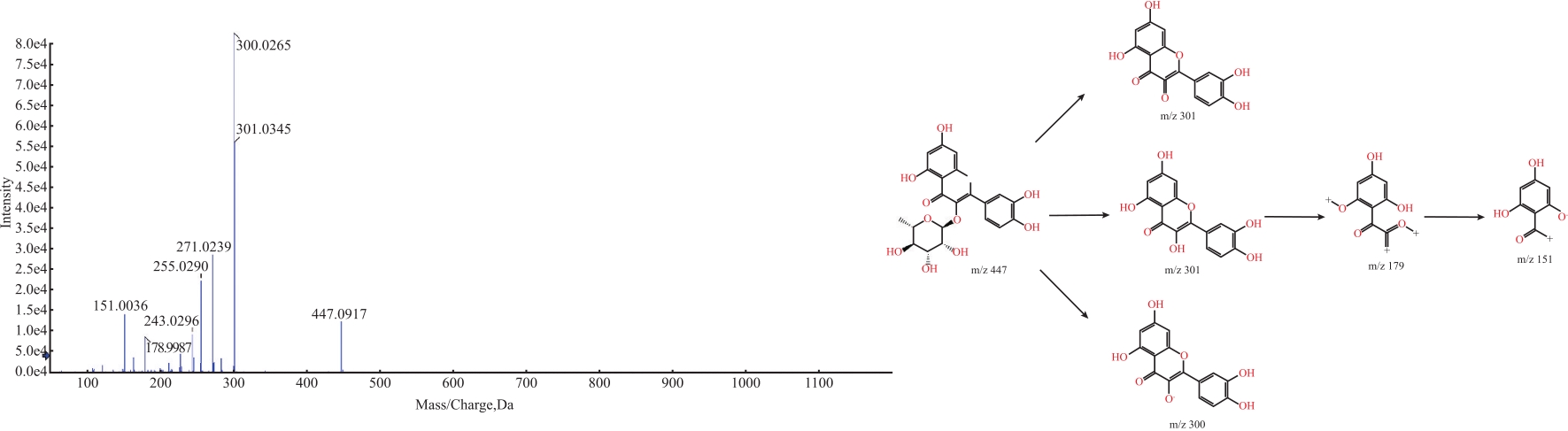 | 图3 槲皮苷的二级质谱和裂解途径 |