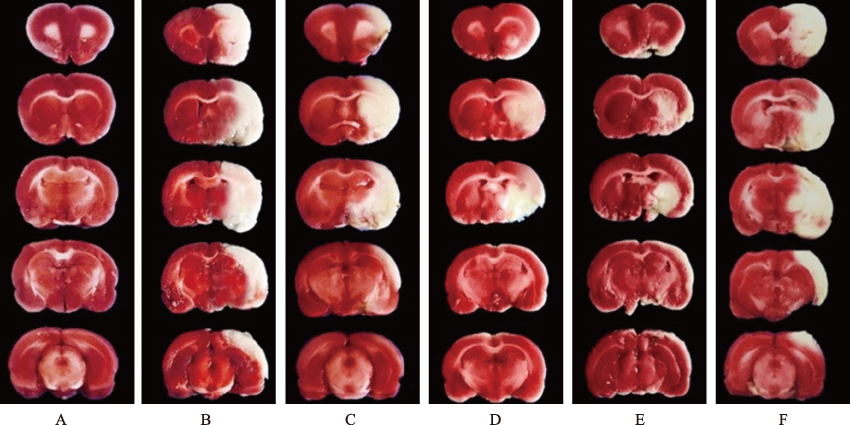 | Fig.1 Cerebral infarct volume in six groups of rats (TTC staining) A:sham operation group;B:model control group;C:low-dose Shuanglu Tongnao decoction group;D:medium-dose Shuanglu Tongnao decoction group;E:high-dose Shuanglu Tongnao decoction group;F:high-dose Shuanglu Tongnao decoction+AICAR group. |