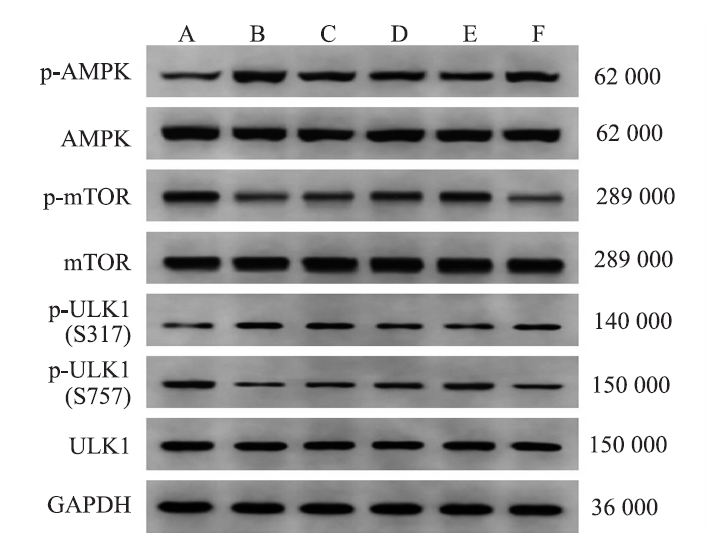 | Fig.5 Expression of AMPK/mTOR signaling pathway related proteins of hippocampal tissue in six groups of rats A:sham operation group;B:model control group;C:low-dose Shuanglu Tongnao decoction group;D:medium-dose Shuanglu Tongnao decoction group;E:high-dose Shuanglu Tongnao decoction group;F:high-dose Shuanglu Tongnao decoction+AICAR group. |